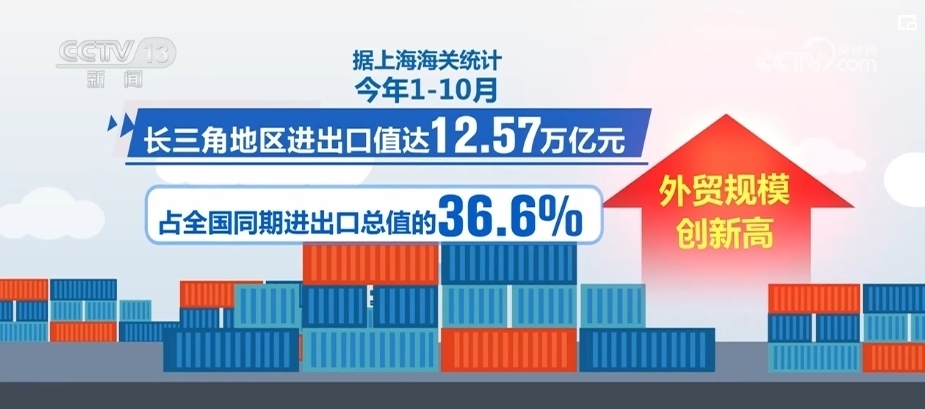 據(jù)上海海關(guān)統(tǒng)計,2023年1—10月,長三角地區(qū)進出口值達12.57萬億元,占全國同期進出口總值的36.6%,外貿(mào)規(guī)模創(chuàng)新高。