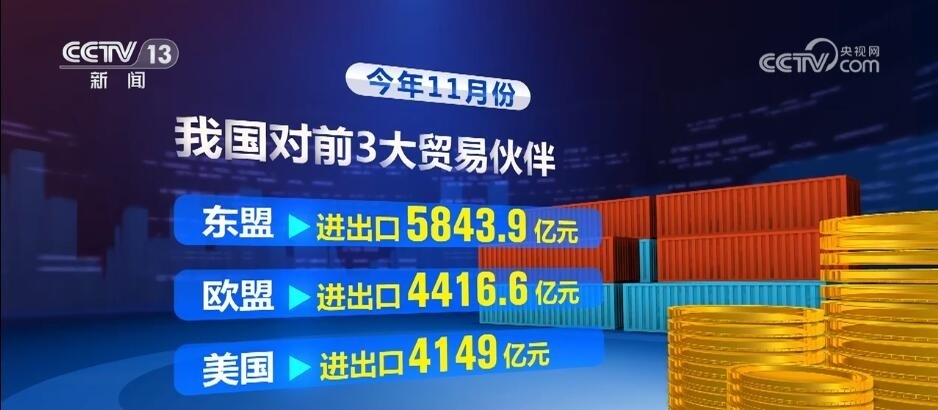 海關(guān)統(tǒng)計(jì)數(shù)據(jù)顯示,今年11月份,我國對前3大貿(mào)易伙伴東盟、歐盟、美國分別進(jìn)出口5843.9億元、4416.6億元、4149億元,合計(jì)占我國進(jìn)出口總值的38.9%;對共建“一帶一路”國家進(jìn)出口1.72萬億元。同期,我國與拉美、非洲、中亞五國進(jìn)出口延續(xù)良好態(tài)勢,分別增長9.3%、8.4%、43%。