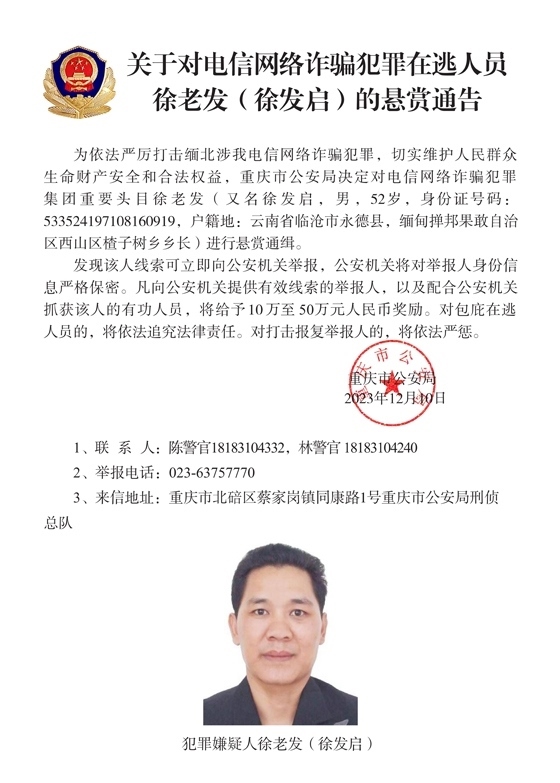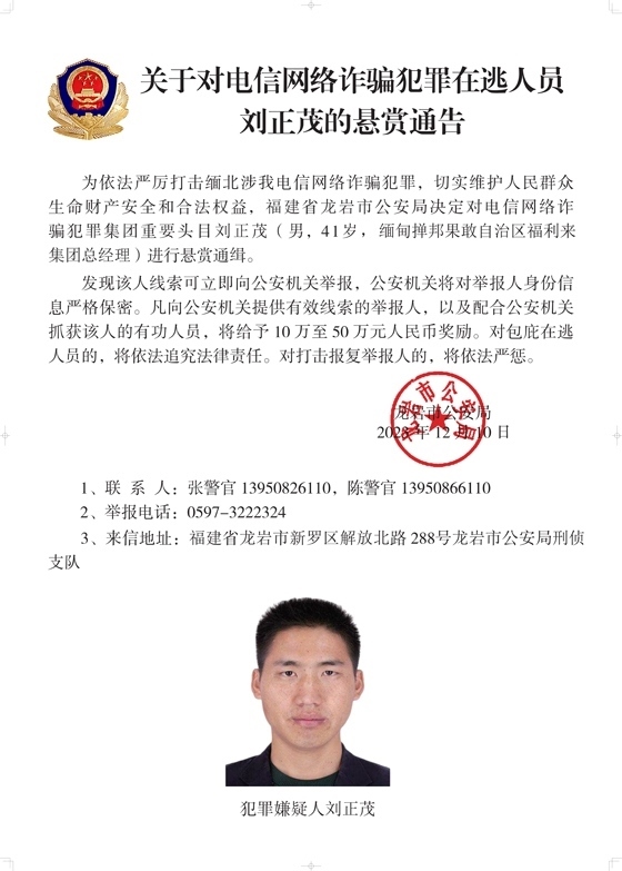 為依法嚴(yán)厲打擊緬北涉我電信網(wǎng)絡(luò)詐騙犯罪,切實維護人民群眾生命財產(chǎn)安全和合法權(quán)益,遼寧省大連市公安局決定對白所成、白應(yīng)蒼(又名李云晨)、白應(yīng)蘭(又名李夢娜)進行公開懸賞通緝;福建省泉州市公安局決定對魏懷仁、魏榕(又名陳榕)、魏青松(又名楊松)進行公開懸賞通緝;福建省龍巖市公安局決定對劉正祥、劉積光(又名李華光)、劉正茂進行公開懸賞通緝;重慶市公安局決定對徐老發(fā)(又名徐發(fā)啟)進行公開懸賞通緝。