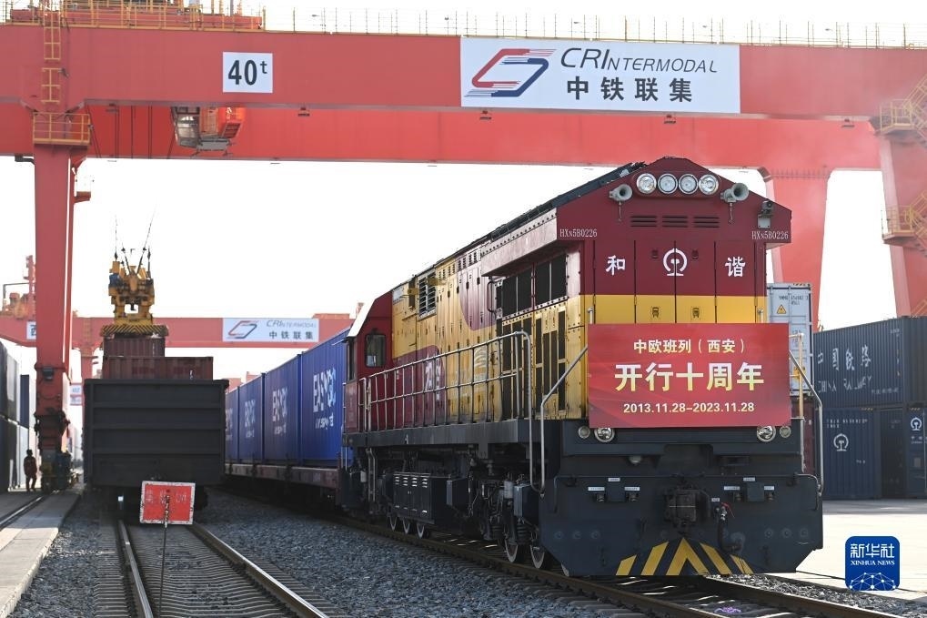 X8155次中歐班列在西安國際港站等待出發(fā)(2023年11月28日攝)。當(dāng)日,滿載貨物的X8155次中歐班列從西安國際港站開往德國漢堡,標(biāo)志著中歐班列(西安)自2013年11月28日開行首趟以來,已累計開行十周年。新華社記者 鄒競一 攝