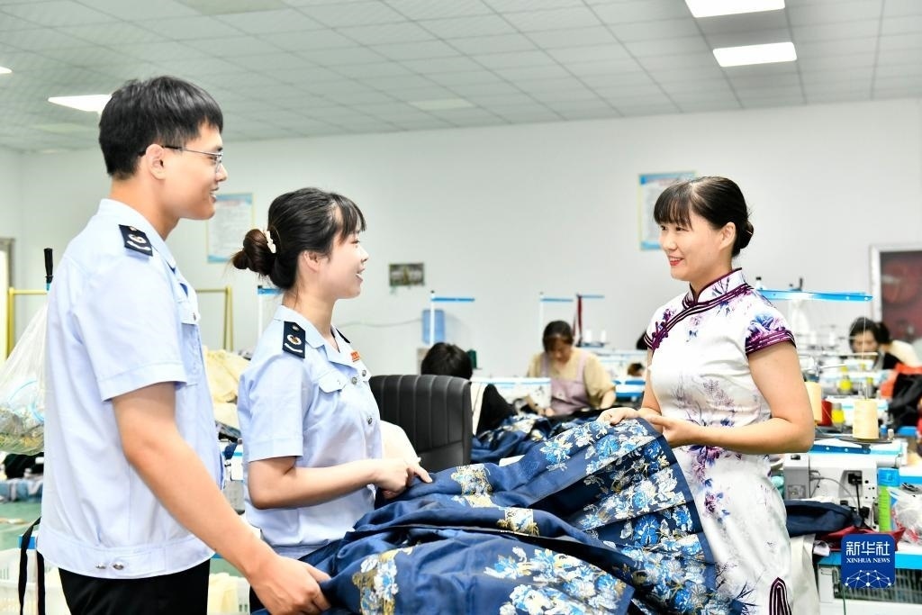 在山東曹縣辰霏服飾有限公司,曹縣稅務(wù)局的工作人員上門走訪,介紹減稅降費助企發(fā)展相關(guān)優(yōu)惠政策(2023年7月6日攝)。新華社記者 郭緒雷 攝