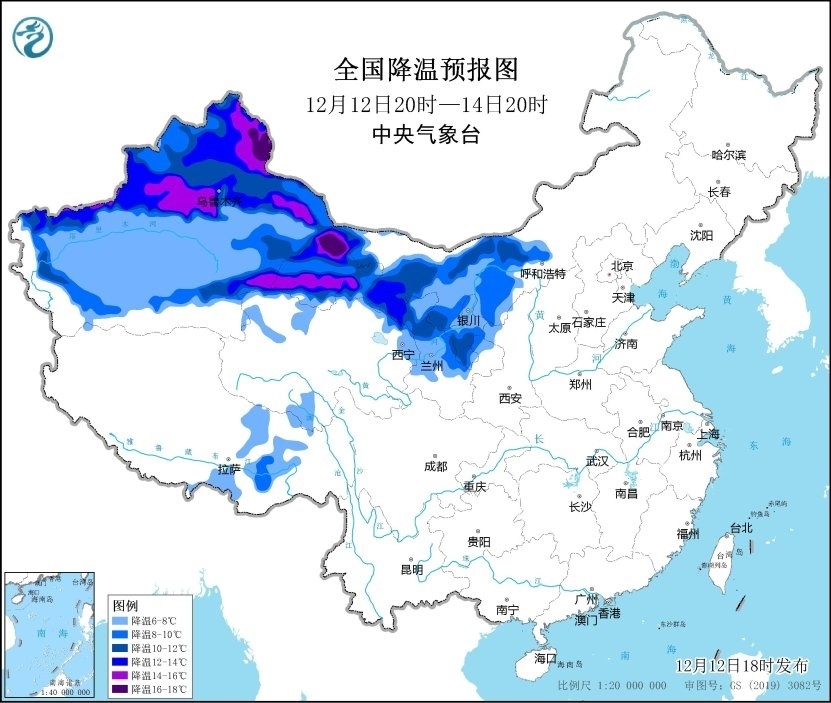 其中,12月12日20時(shí)至12月14日20時(shí),新疆、內(nèi)蒙古西部、甘肅、寧夏等地將出現(xiàn)8~12℃降溫,新疆北部、甘肅西部局地降溫可達(dá)14℃以上。
