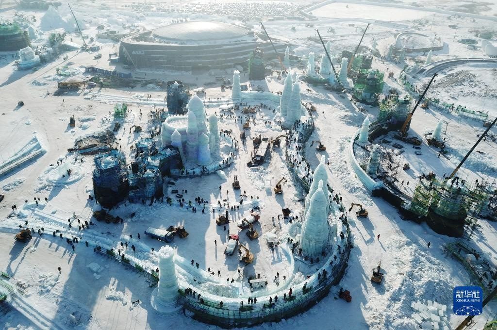 12月12日,在黑龍江省哈爾濱市冰雪大世界建設(shè)現(xiàn)場,工人在零下20多攝氏度的低溫下施工作業(yè)(無人機(jī)照片)。