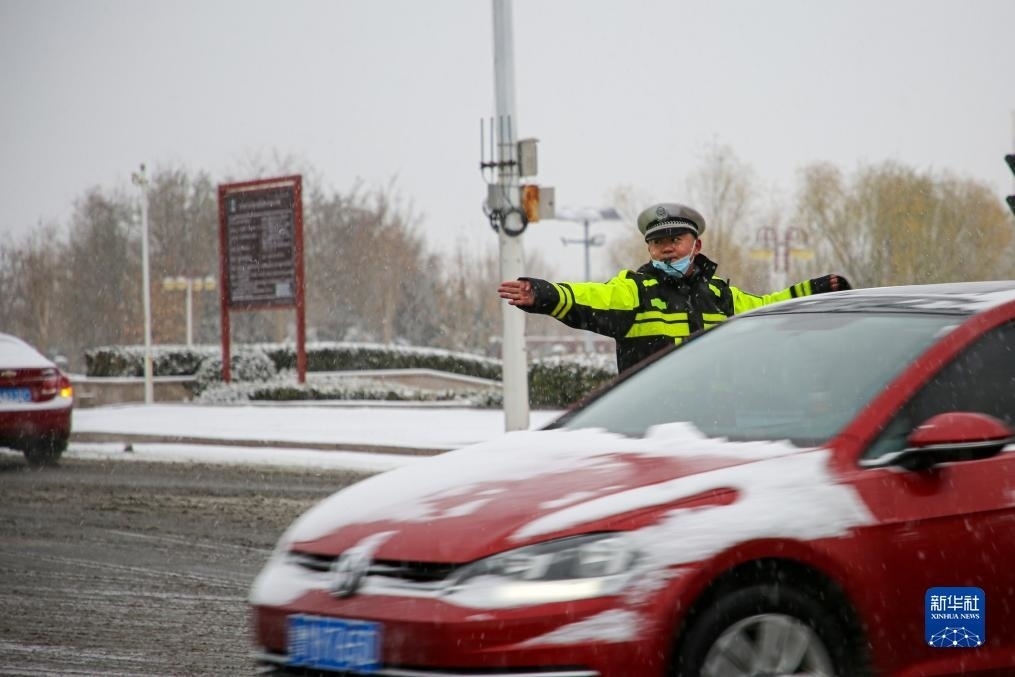 12月11日,在山東省濱州市沾化區(qū),交警在雪中引導(dǎo)車輛有序通行。