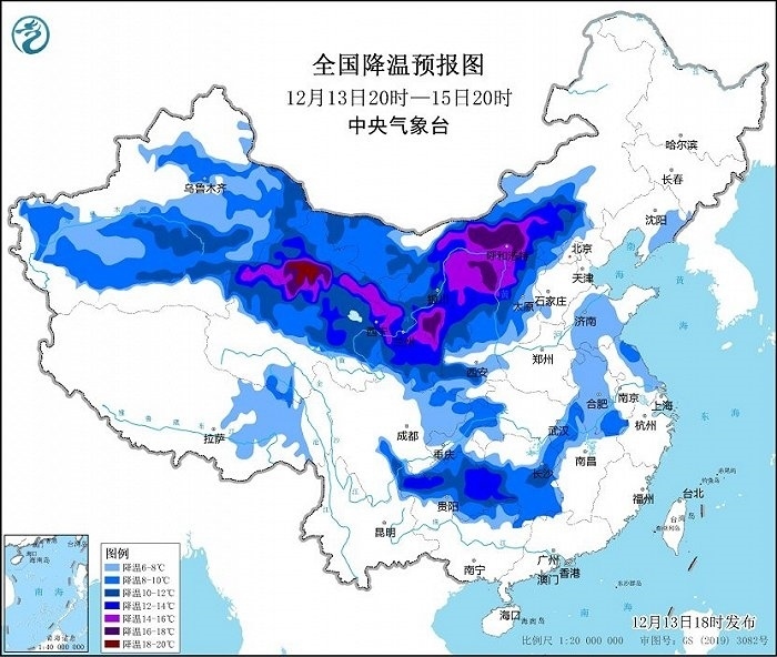 其中,12月13日20時(shí)至12月15日20時(shí),新疆中東部、內(nèi)蒙古中西部、甘肅、寧夏、青海、陜西中北部、山西北部等地將出現(xiàn)8~12℃降溫,甘肅、內(nèi)蒙古河套地區(qū)、陜西北部局地降溫可達(dá)14℃以上。