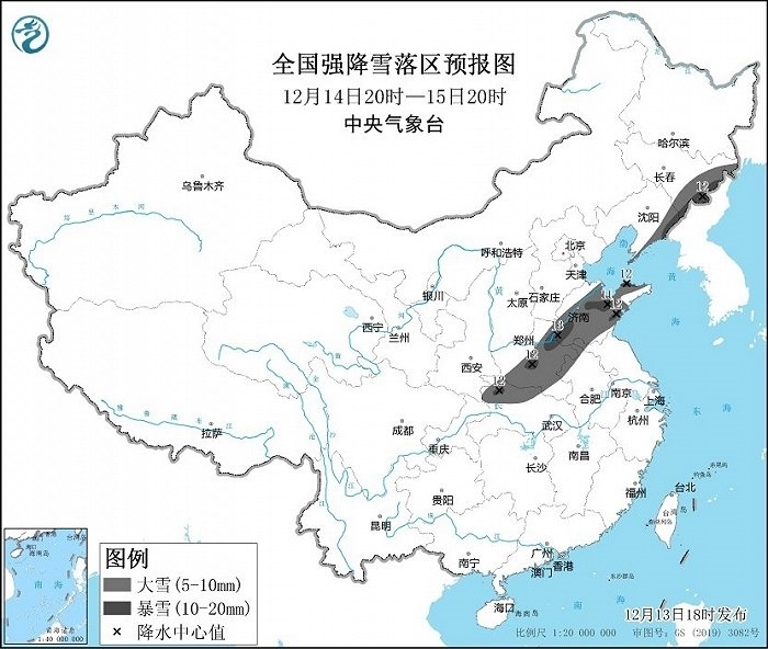 預(yù)計(jì)12月13日20時(shí)至12月14日20時(shí),內(nèi)蒙古河套地區(qū)、陜西北部和中部以及秦嶺東部、山西南部、湖北西北部、河南中西部、河北中南部、北京西南部、山東北部和西部、遼寧東北部等地部分地區(qū)有大到暴雪,其中,河南西部和陜西秦嶺東部局地有大暴雪或特大暴雪(30~35毫米)。上述部分地區(qū)新增積雪深度5~10厘米,局地可達(dá)18厘米以上。