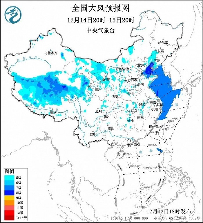 預(yù)計(jì),12月13日20時(shí)至14日20時(shí),新疆東部和南疆盆地、內(nèi)蒙古中西部、寧夏、西藏西部、青海等地部分地區(qū)有5~6級(jí)、陣風(fēng)7~8級(jí)的大風(fēng),其中,新疆山口地區(qū)、青海西部、西藏西北部等地部分地區(qū)有7~9級(jí)、陣風(fēng)10~11級(jí)的大風(fēng);渤海、南海東北部部分海域?qū)⒂?~8級(jí)、陣風(fēng)9級(jí)的大風(fēng)。