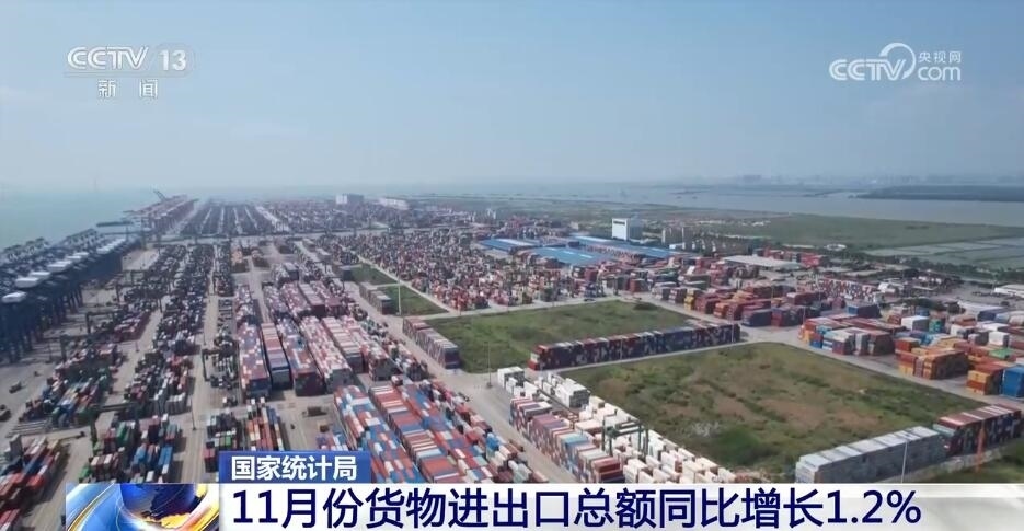 貨物進出口同比增長,貿易結構繼續(xù)優(yōu)化,11月份,貨物進出口總額同比增長1.2%,比上月加快0.3個百分點。