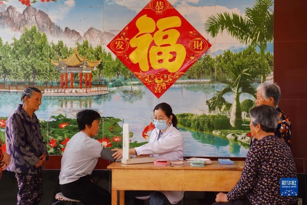 河北省平鄉(xiāng)縣尋召村村醫(yī)在“幸福小院”內(nèi)為老人們量血壓(2023年4月20日攝)。近年來(lái),河北省平鄉(xiāng)縣利用農(nóng)村閑置院落,按照“就近集中、鄰里互助、抱團(tuán)養(yǎng)老”的模式,采取社會(huì)捐助、鄉(xiāng)村籌集、縣財(cái)政補(bǔ)助等形式,先后打造出300余個(gè)“幸福小院”。新華社記者 牟宇 攝