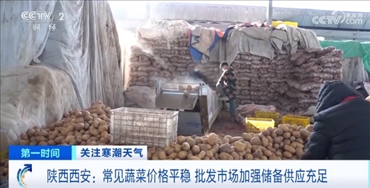 在西安一家大型農(nóng)副產(chǎn)品批發(fā)市場(chǎng),為了應(yīng)對(duì)寒潮天氣帶來的影響,常年做蔬菜批發(fā)生意的戴建軍早在土豆產(chǎn)地建起庫(kù)房,大量收購(gòu)?fù)炼?,增加運(yùn)輸車輛,確保土豆能及時(shí)運(yùn)到西安。