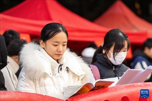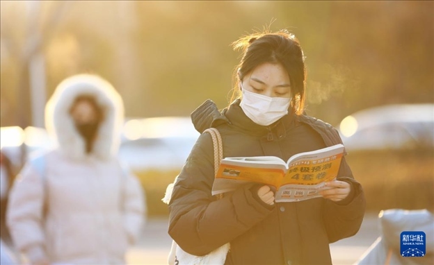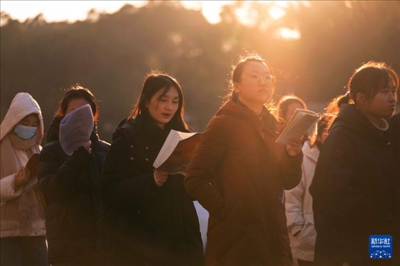 12月23日,在湖南省長沙市,考生在湖南農(nóng)業(yè)大學(xué)考點排隊時抓緊復(fù)習(xí)。