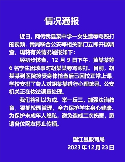 ·安徽望江縣教育局通報女生遭6人辱罵毆打,警方正調(diào)查處理。