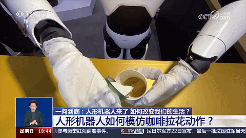 2023年8月,2023世界機(jī)器人大會(huì)在北京開(kāi)幕,現(xiàn)場(chǎng)有個(gè)人形機(jī)器人可以模仿“咖啡拉花”動(dòng)作——開(kāi)始,把兩個(gè)杯子(裝有咖啡、牛奶)遞給人形機(jī)器人;稍后,人形機(jī)器人運(yùn)行AI智能算法,指揮它用“手”完成“咖啡拉花”作業(yè)。