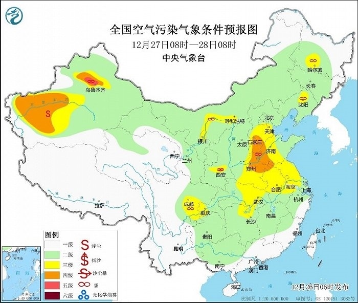 冷空氣勢力弱,霧和霾天氣又要登場。今天,華北、黃淮等地有輕度霾,局地中度或重度霾,27日華北中南部大氣擴(kuò)散條件將有所改善。28日至30日,華北中南部、黃淮中西部、汾渭平原等地大氣擴(kuò)散條件再次轉(zhuǎn)差,將有輕至中度霾,部分地區(qū)重度霾。此外,28日至30日的夜間至上午時段,華北中南部、黃淮、江淮東部、江漢、四川盆地等地的部分地區(qū)有大霧,局地有能見度不足200米的強(qiáng)濃霧。