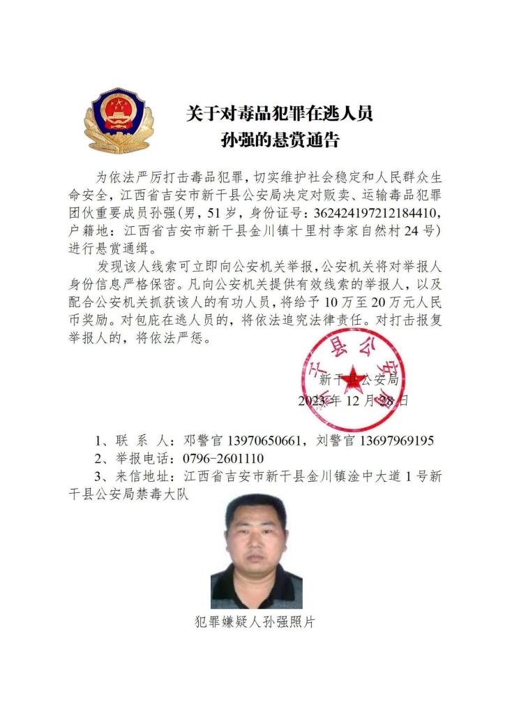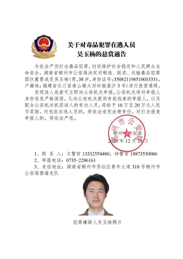 其中,湖南省郴州市公安局決定對張安龍、馬文祥、吳玉楊進行公開懸賞通緝;湖南省株洲市公安局決定對楊金梅進行公開懸賞通緝;江西省新干縣公安局決定對曾小勇、李國平、孫強進行公開懸賞通緝;浙江省溫州市公安局決定對顏歡平進行公開懸賞通緝;四川省遂寧市公安局決定對母朝東進行公開懸賞通緝;貴州省黔東南州公安局決定對龍華進行公開懸賞通緝。