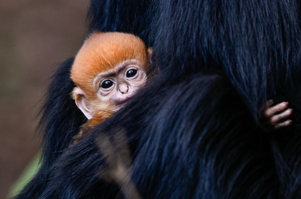在貴州麻陽河國家級自然保護(hù)區(qū)拍攝的黑葉猴幼猴(4月30日攝)。新出生的黑葉猴毛色呈金黃色,幾個月后逐漸變成黑色。