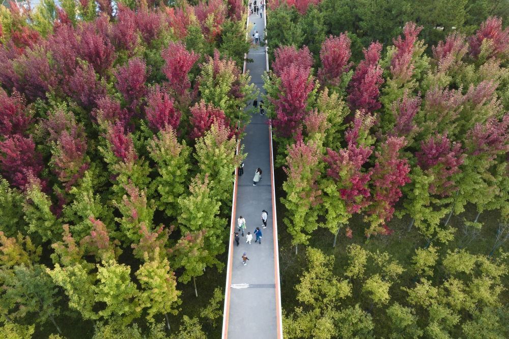 10月7日,市民在陜西西安雁南公園內(nèi)駐足觀景(無人機(jī)照片)。