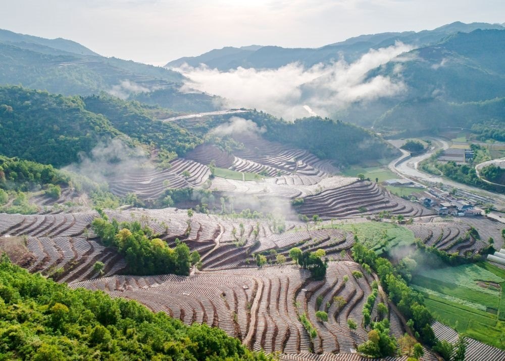 陜西省漢中市略陽縣郭鎮(zhèn)譚家莊村綜合治理后的梯田(4月26日攝,無人機(jī)照片)。