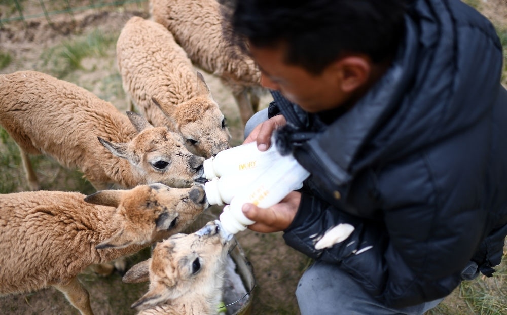 青海三江源國家公園可可西里管理處索南達(dá)杰保護(hù)站隊(duì)員才仁多杰在給被救助的藏羚羊幼仔喂奶(7月28日攝)。