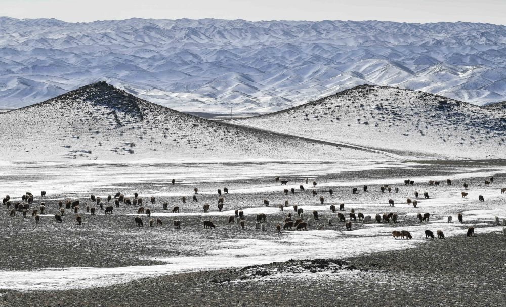 羊群在新疆裕民縣巴爾魯克山南坡的冬牧場上覓食(2月10日攝)。