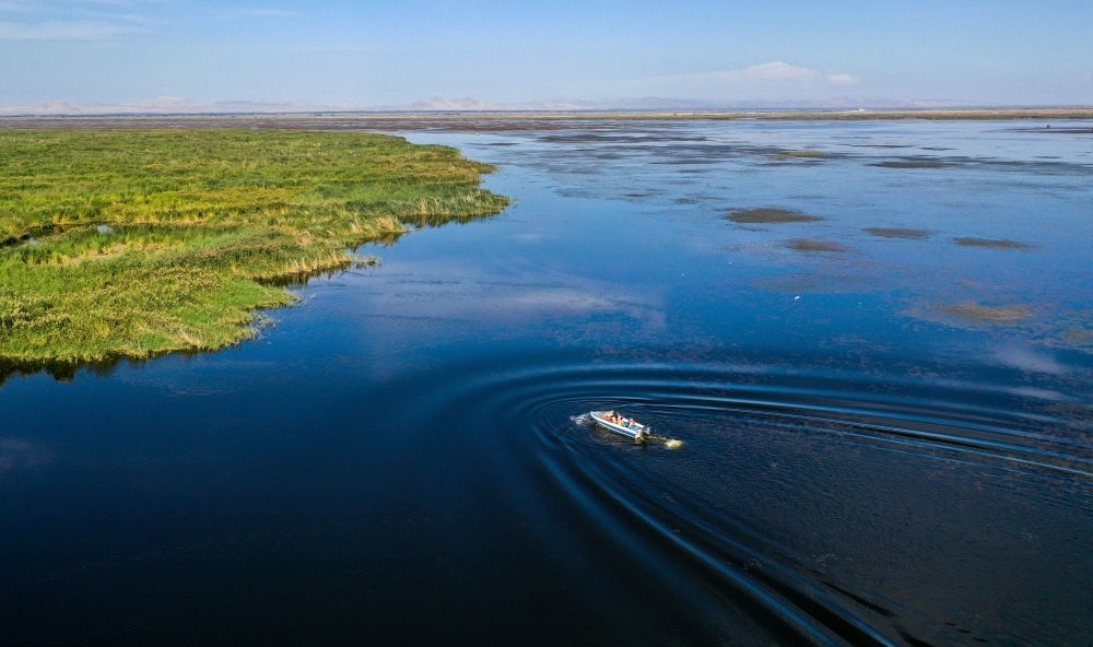 9月15日,在內(nèi)蒙古烏梁素海湖面上,河湖濕地水環(huán)境保護(hù)與修復(fù)技術(shù)研究團(tuán)隊(duì)成員乘坐快艇去采集湖水樣本(無人機(jī)照片)。