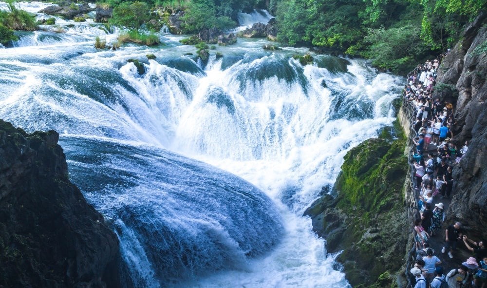 8月16日,游客在貴州省安順市黃果樹瀑布景區(qū)游覽(無人機(jī)照片)。