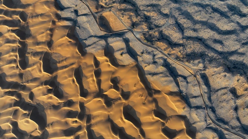 位于寧夏中衛(wèi)市沙坡頭騰格里沙漠邊緣的治沙林帶與沙漠交匯處(9月6日攝,無人機(jī)照片)。