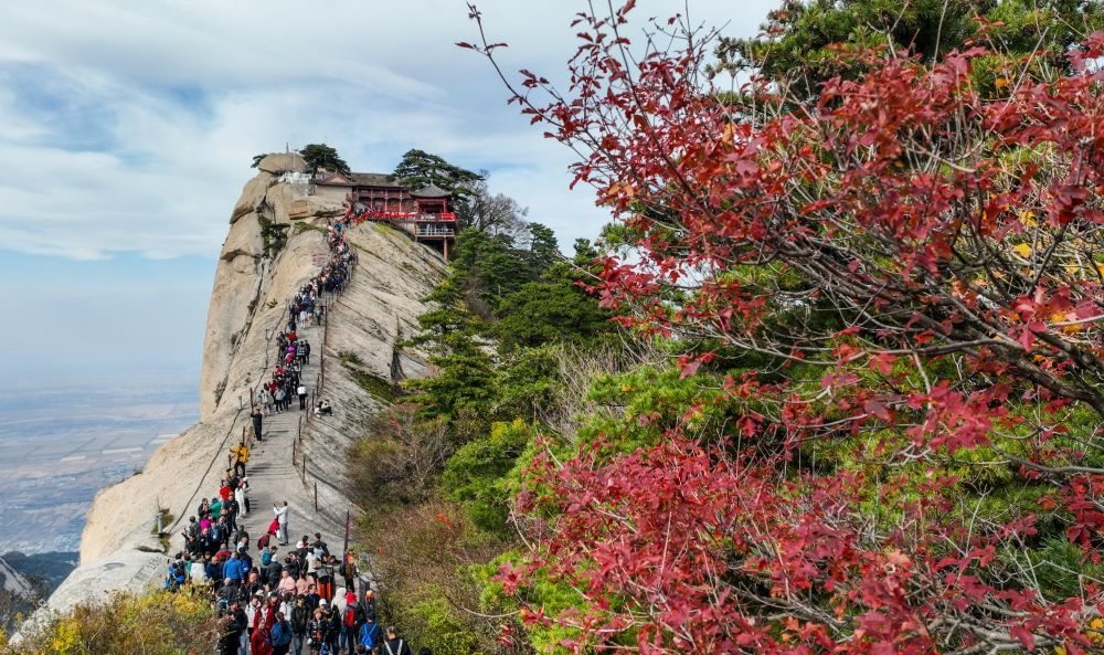 10月19日,游人在攀登西岳華山蓮花峰(無人機(jī)照片)。