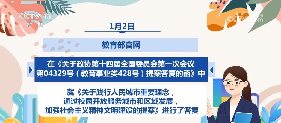 1月2日,教育部官網(wǎng)在《關(guān)于政協(xié)第十四屆全國委員會第一次會議第04329號(教育事業(yè)類428號)提案答復(fù)的函》中,就《關(guān)于踐行人民城市重要理念,通過校園開放服務(wù)城市和區(qū)域發(fā)展,加強(qiáng)社會主義精神文明建設(shè)的提案》進(jìn)行了答復(fù)。