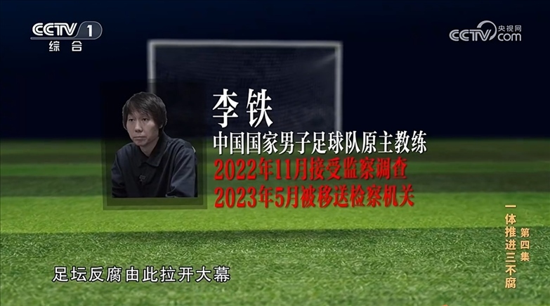 【解說詞】李鐵是本次專案第一個(gè)接受監(jiān)察調(diào)查并被留置的人員,事實(shí)證明,這個(gè)切入點(diǎn)的選擇是非常精準(zhǔn)的。他既在多家俱樂部擔(dān)任過教練,又曾擔(dān)任中國(guó)國(guó)家男子足球隊(duì)主教練,在足球領(lǐng)域關(guān)系盤根錯(cuò)節(jié),以他為突破口縱深挖掘、橫向拓展,牽出了從聯(lián)賽到國(guó)家隊(duì)、從俱樂部到足協(xié)的若干涉嫌違紀(jì)違法犯罪人員,以及種種黑幕和制度漏洞。