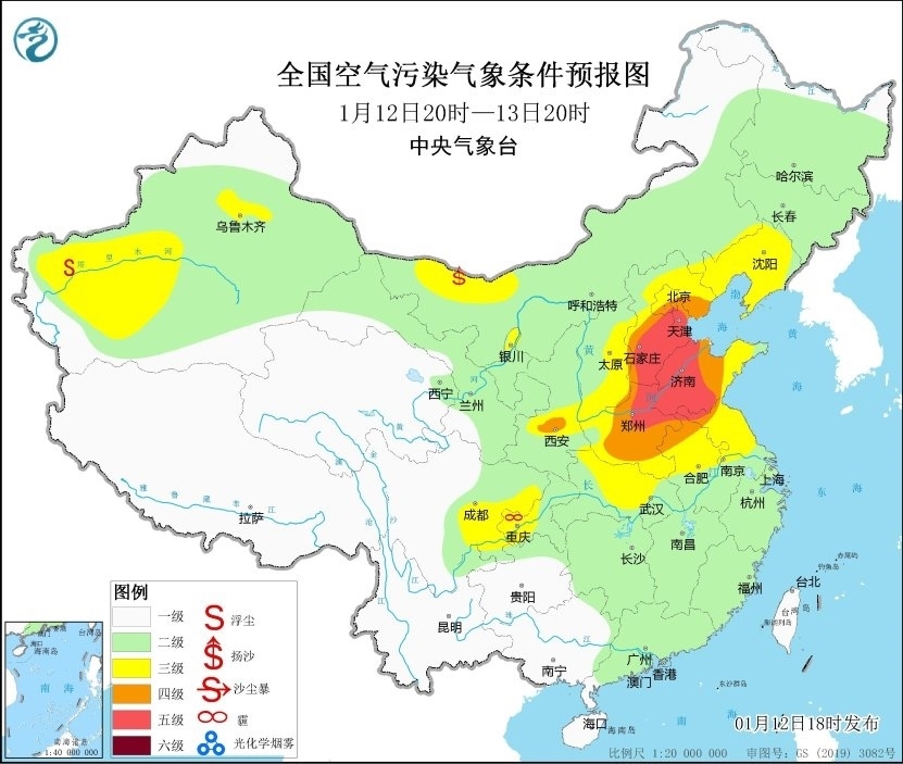 12日夜間至13日,華北中南部、黃淮、江淮、江漢、四川盆地等地大氣擴散條件較差,有輕至中度霾,其中天津、河北南部、山東西部、河南中北部等地有重度霾。14日白天起,受冷空氣影響,上述地區(qū)霾天氣自北向南逐漸減弱消散。