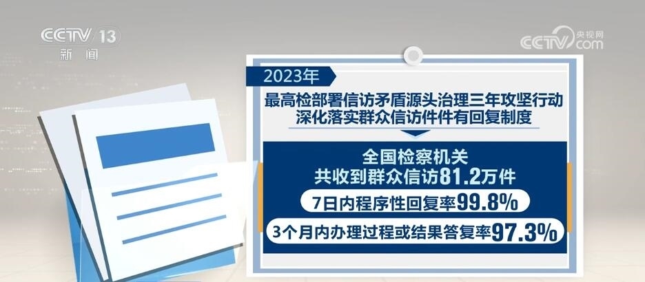 2023年,最高檢部署信訪矛盾源頭治理三年攻堅(jiān)行動(dòng),深化落實(shí)群眾信訪件件有回復(fù)制度。全國檢察機(jī)關(guān)共收到群眾信訪81.2萬件,7日內(nèi)程序性回復(fù)率99.8%,3個(gè)月內(nèi)辦理過程或結(jié)果答復(fù)率97.3%。