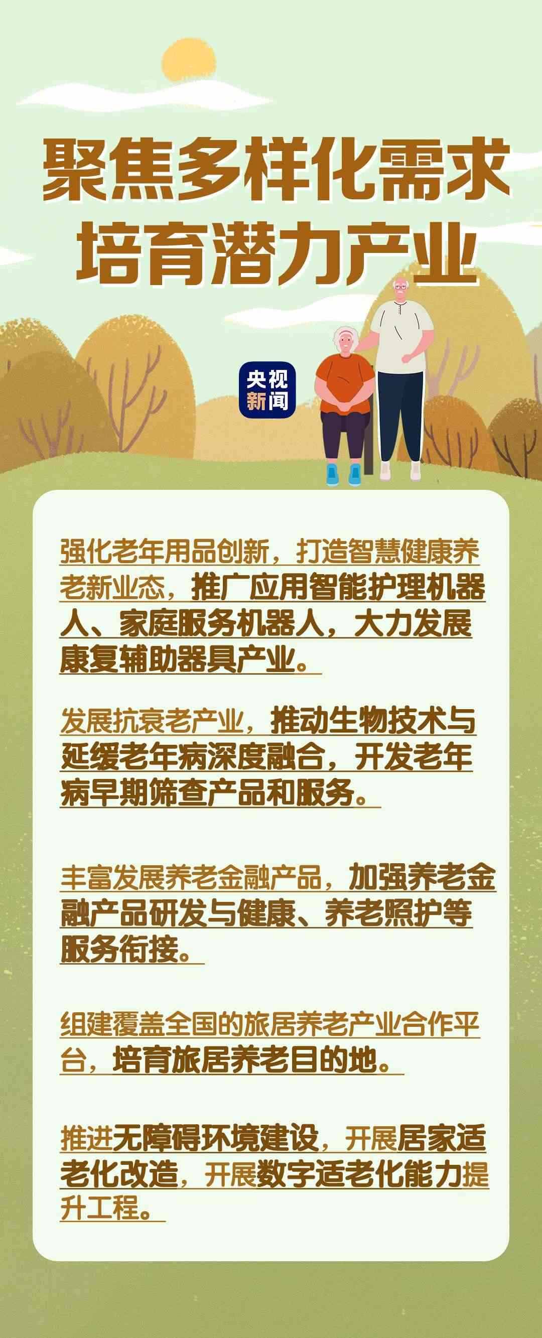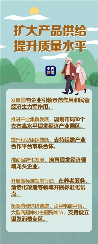 在民生事業(yè)方面,國家將擴大和發(fā)展七方面的服務(wù),包括養(yǎng)老助餐、居家助老、社區(qū)便民、老年健康、養(yǎng)老照護、老年文體、農(nóng)村養(yǎng)老等方面的服務(wù)。國務(wù)院辦公廳印發(fā)《關(guān)于發(fā)展銀發(fā)經(jīng)濟增進老年人福祉的意見》中提出了4個方面舉措,小編根據(jù)文件內(nèi)容進行了簡要梳理,一圖了解“銀發(fā)經(jīng)濟”核心要點。↓↓↓