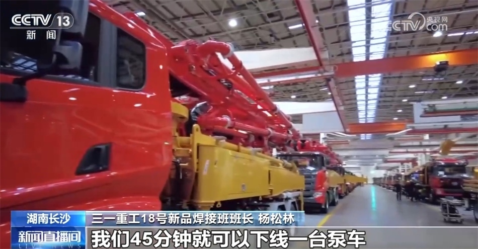 三一重工18號新品焊接班班長 楊松林:大家好,我是新品焊接班班長楊松林。我們工廠主要是生產(chǎn)泵車,看,就是我身后的這個大家伙。我們45分鐘就可以下線一臺泵車。