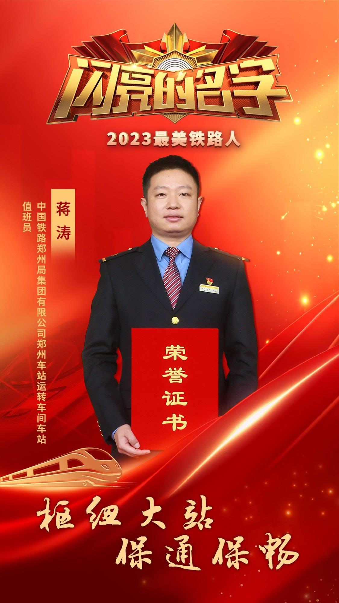 獲得2023年“最美鐵路人”稱號的10名個人和1個集體分別是蔣濤、王庭虎、張華、李軍、王笑冰、米爾班?艾依提、斯朗旺扎、馬小利、陳燕平、朱少銘,以及通化橋隧第一維修小組。