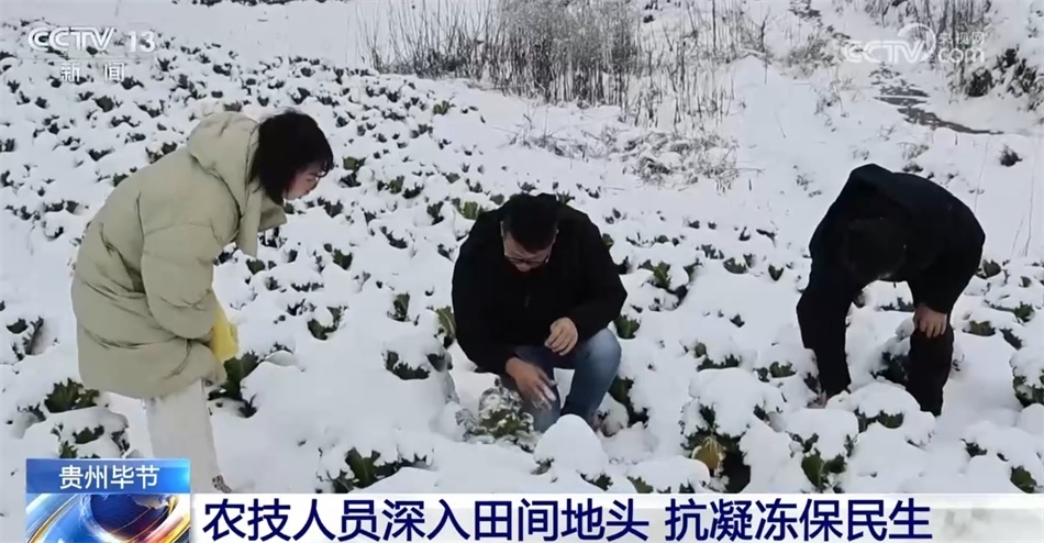 在貴州畢節(jié)螺絲村蔬菜基地,田間地頭白茫茫一片。為應對低溫凝凍天氣,當?shù)剞r(nóng)技人員現(xiàn)場查看蔬菜長勢,為農(nóng)戶講解蔬菜防凍知識,指導做好防寒抗凍措施。