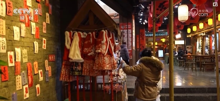 在中國人的習(xí)俗中,過年少不了趕集。長(zhǎng)沙在宋朝時(shí)被稱作潭州,是重要的商業(yè)中心之一。在宋風(fēng)市井文化體驗(yàn)地潭州市集,春聯(lián)、龍燈等裝飾,吸引了不少游客。