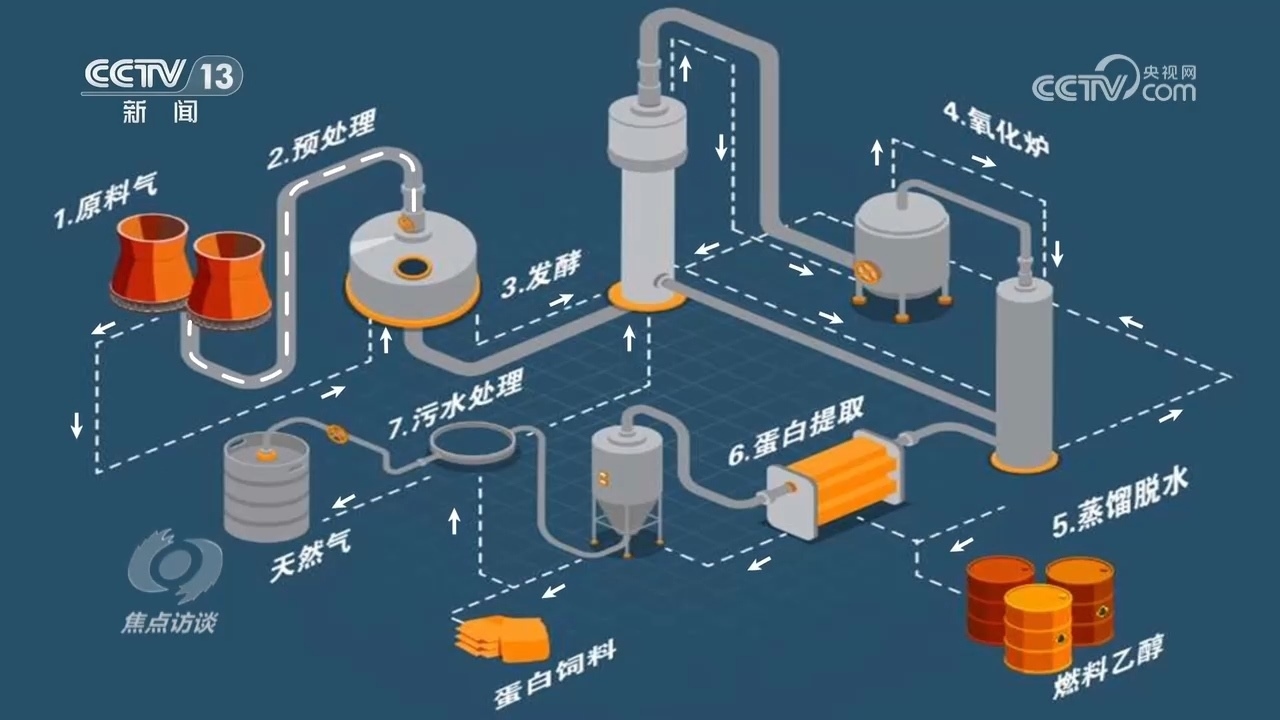 河北首朗新能源科技有限公司副總經(jīng)理楊艷:“首先工業(yè)尾氣通過管道輸送到氣體預處理工段,經(jīng)過簡單的壓縮和煤氣凈化,由管道輸送到核心發(fā)酵工段,氣體從發(fā)酵罐的底部進入到頂部,單程只有幾十秒的時間?!?/p>