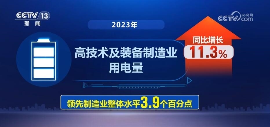 來自中國電力企業(yè)聯(lián)合會數(shù)據(jù)顯示,2023年,高技術(shù)及裝備制造業(yè)用電量同比增長11.3%,領(lǐng)先制造業(yè)整體水平3.9個百分點(diǎn)。