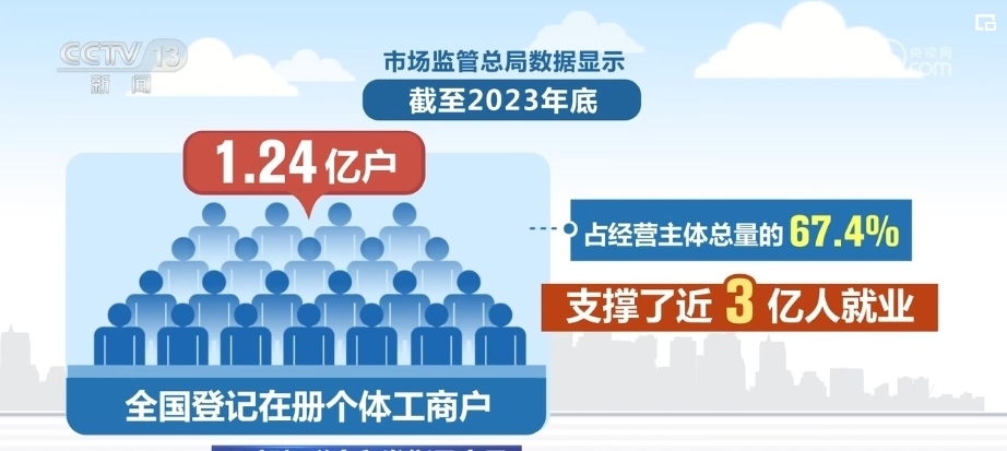 市場(chǎng)監(jiān)管總局?jǐn)?shù)據(jù)顯示,截至2023年底,全國登記在冊(cè)個(gè)體工商戶1.24億戶,占經(jīng)營主體總量的67.4%,支撐了近3億人就業(yè)。