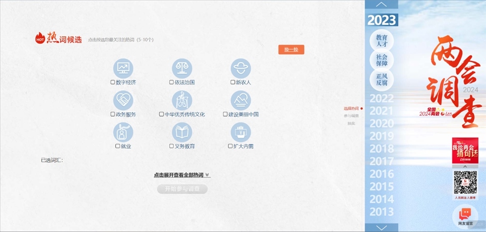 1、登錄人民網(wǎng)2024年全國兩會調(diào)查頁面。
