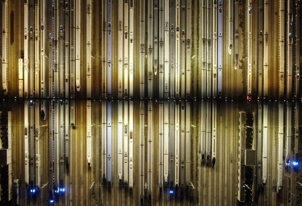 2024年1月26日凌晨,動(dòng)車(chē)組列車(chē)??吭趶V州動(dòng)車(chē)段的存車(chē)線上(無(wú)人機(jī)照片)。新華社記者 鄧華 攝