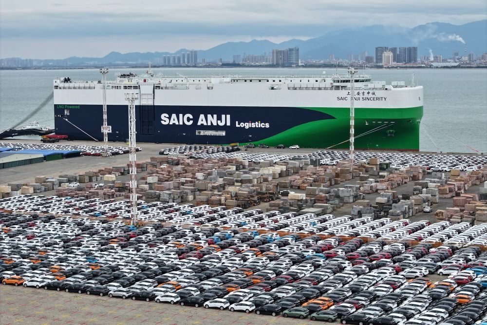 2024年1月23日,“上汽安吉申誠(chéng)”號(hào)汽車(chē)滾裝船??吭诟=◤B門(mén)東渡港區(qū)現(xiàn)代碼頭(無(wú)人機(jī)照片)。新華社記者 姜克紅 攝