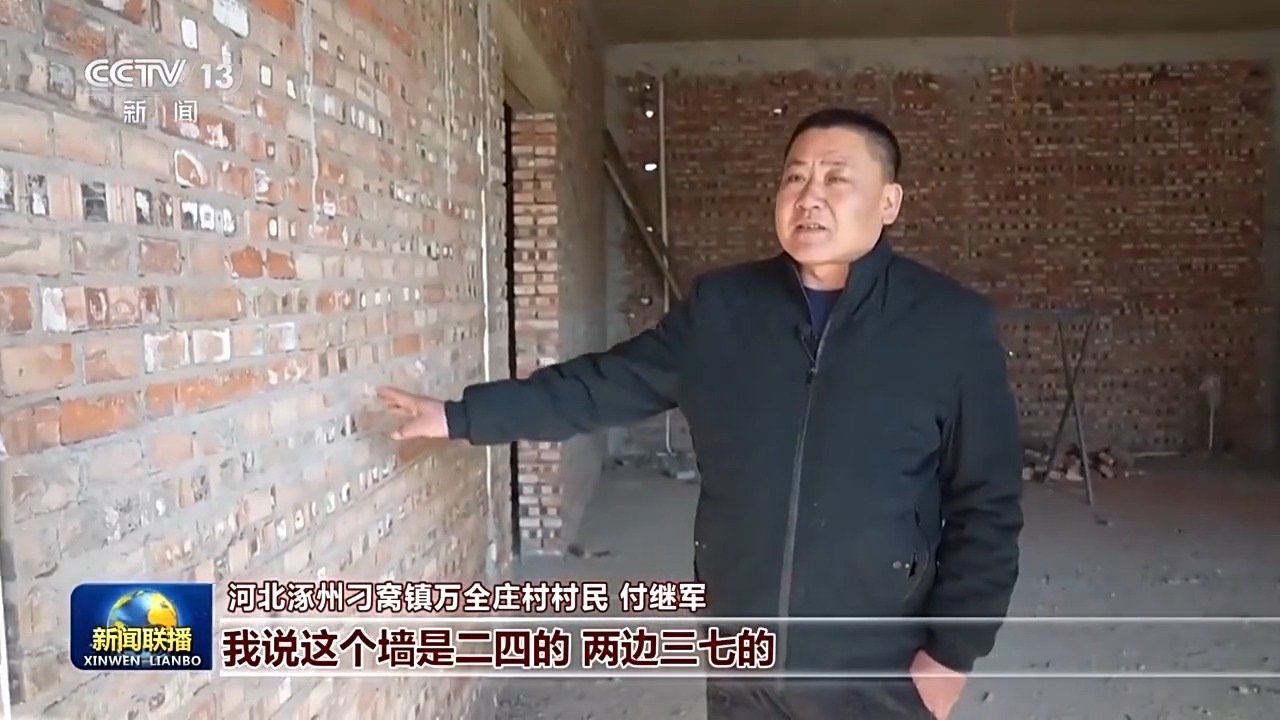 河北涿州刁窩鎮(zhèn)萬全莊村村民 付繼軍:去年,總書記來那會兒這個房子剛壘墻壘到這個位置,總書記還這么摸了摸,說這活兒干得挺好,問了問我這是三七墻呀二四墻呀,我說這個墻是二四的,兩邊三七的,看著總書記特別溫暖,那會兒真是掉眼淚。準備抓緊裝修,盡快搬進來,村里邊現(xiàn)在大家也都干勁挺大的,盡最大努力,把日子過好。