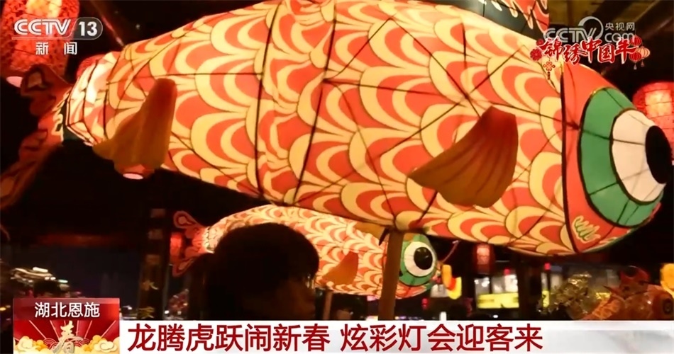 在湖北恩施,夜幕下的宣恩貢水河兩岸,各色花燈匯成燈的海洋,燈火璀璨、流光溢彩,非常喜慶熱鬧。各種“龍”元素出現(xiàn)在各個(gè)角落,特色美食配美景讓這座小城年味更加濃郁。
