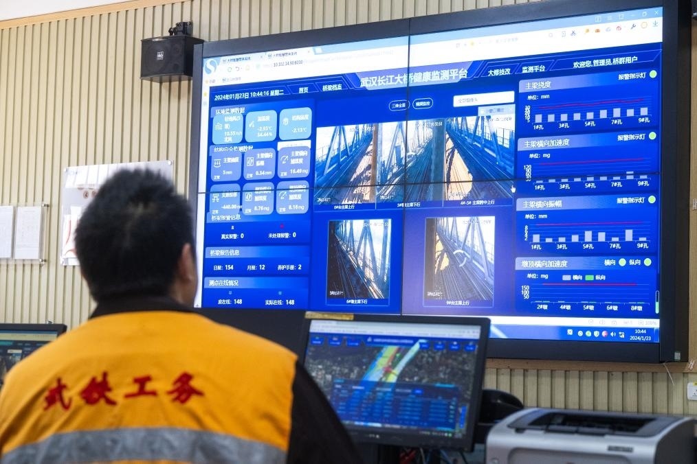 進入高鐵時代,隨著技術的發(fā)展與進步,大橋養(yǎng)修標準提升,養(yǎng)護水平不斷提高。在武漢長江大橋橋梁車間辦公樓一樓的主控室,大屏上顯示著大橋數(shù)十處關鍵處所監(jiān)控畫面,大橋上橋梁防撞監(jiān)控系統(tǒng)和橋梁健康監(jiān)測系統(tǒng)的各項數(shù)據(jù)實時更新。