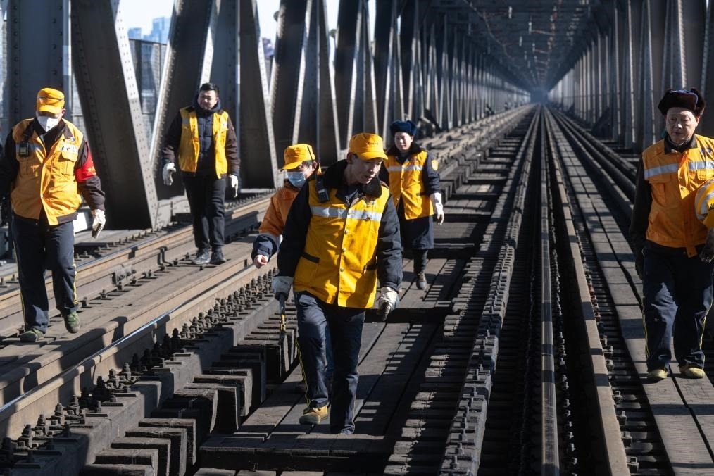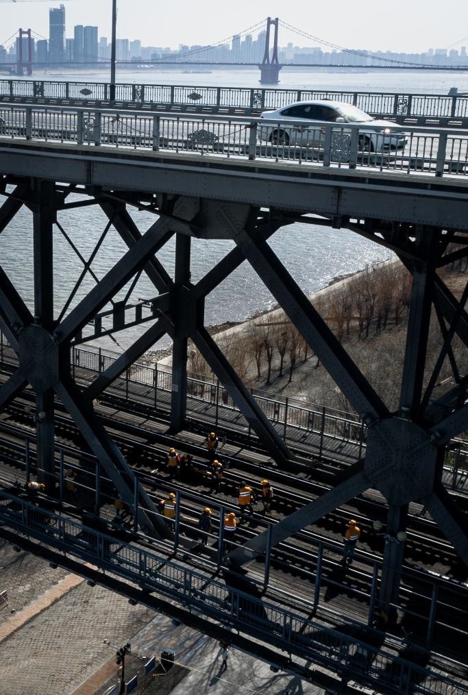 農(nóng)歷大年初三,湖北武漢陽光明媚?!叭f里長江第一橋”——武漢長江大橋宛若一條巨龍飛架于江水之上,氣勢恢宏。身穿工作服的陳卿明和同事,低頭、彎腰,循著大橋鐵道仔細地檢視鋼梁、枕木。