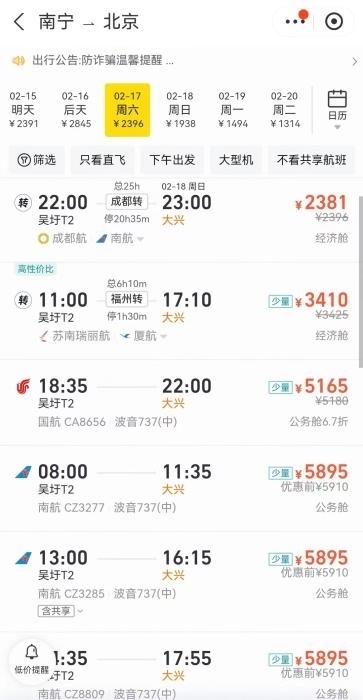 中新網(wǎng)2月16日電(中新財經(jīng)記者 謝藝觀)“火車票沒搶到,機票也沒經(jīng)濟艙的了”“回滬機票價格漲了3倍”“回京只剩高價公務(wù)艙”……