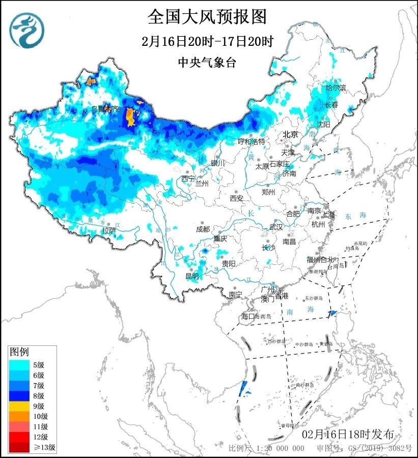 中央氣象臺2月16日18時發(fā)布大風藍色預(yù)警。