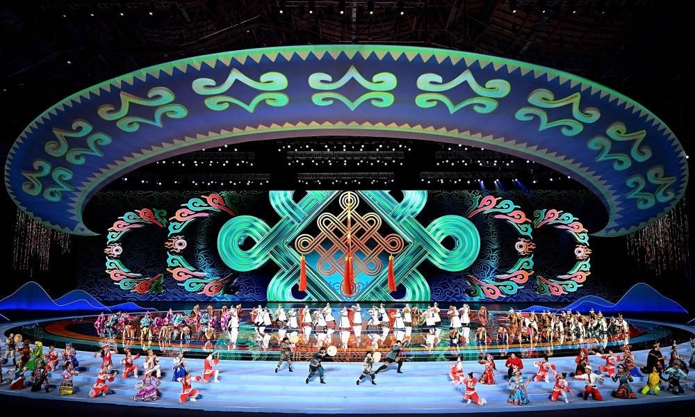 天津年畫、蘇州園林、福建土樓、西藏布達拉宮……在開幕式的代表團入場環(huán)節(jié),各省區(qū)市的人文風(fēng)情和地標元素通過剪紙、國潮風(fēng)彩繪等藝術(shù)風(fēng)格展現(xiàn),搭配著《鄂倫春小唱》《美麗的草原我的家》《駿馬奔馳保邊疆》等耳熟能詳?shù)膬?nèi)蒙古音樂,讓觀眾領(lǐng)略到中華民族輝煌璀璨的文化。
